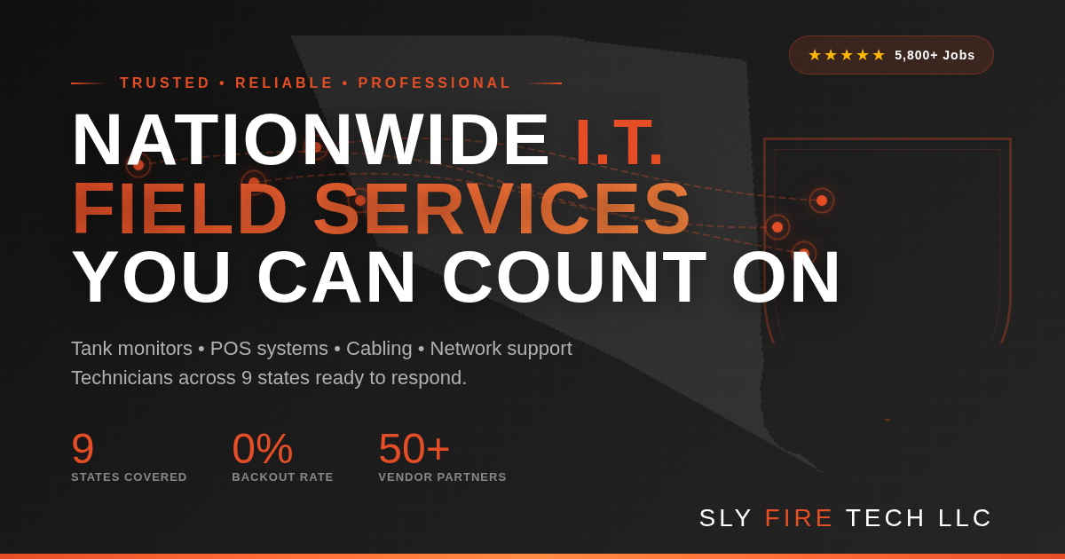 Sly Fire Tech LLC provides reliable, professional field services across the United States. With technicians in 9 states and over 5,800 completed work orders, we deliver consistent results for vendors and clients who need boots on the ground.